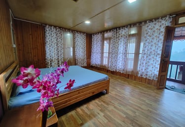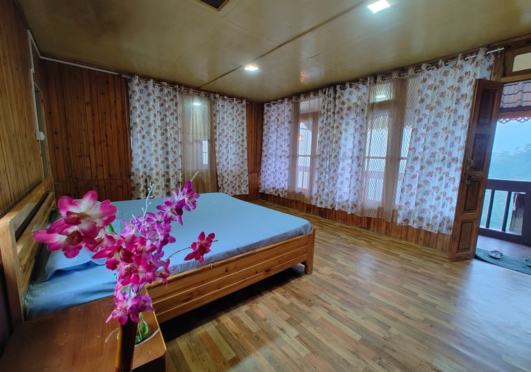 Relax in wooden cottages with valley views and peaceful balconies.